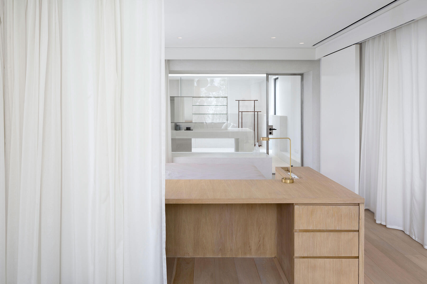The interior design of the villas takes its cues from the architecture, which consists of two primary elements: the undulating brick walls at the base and the floating white boxes above. The clear delineation of materiality on the surface is also a signifier for the programmatic separation of public and private realms inside.