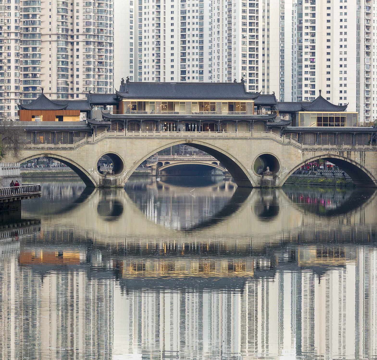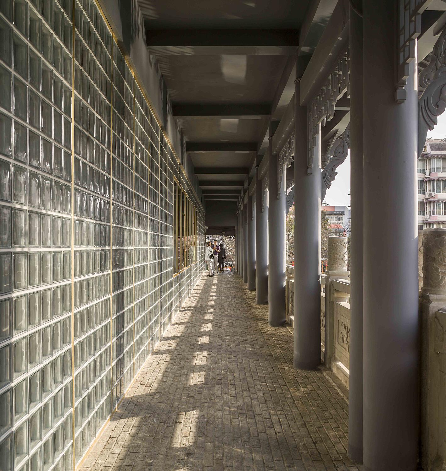 建于晚清时期的安顺廊桥位于成都两条主要河流的交汇处。在保留传统建筑现有结构和屋顶轮廓的同时,如恩在原有的布局中规划出新的空间,将餐厅与酒吧围合于其中。网格玻璃外立面的设计灵感源于四川本土建筑的结构柱网,室内的木盒子元素为空间带来了一丝暖意,而金属元素则又增添了几分奢华的气质。廊桥两端的楼梯使用了新的材料,被赋予了不同的性格,混凝土墙采用铜质的细节修饰,具有强烈的视觉凝聚力,将人们吸引至空间内部。餐厅外部原有的两条通道仍旧对公众开放,因而顾客在用餐时可以不时地看到窗外路过的行人,模糊了室内外活动的边界。夜晚,餐厅的灯光从室内散发出来,勾勒出整座建筑的优雅轮廓,与水中的倒影相映成趣,为河光夜色独添一道醉人的风情。
