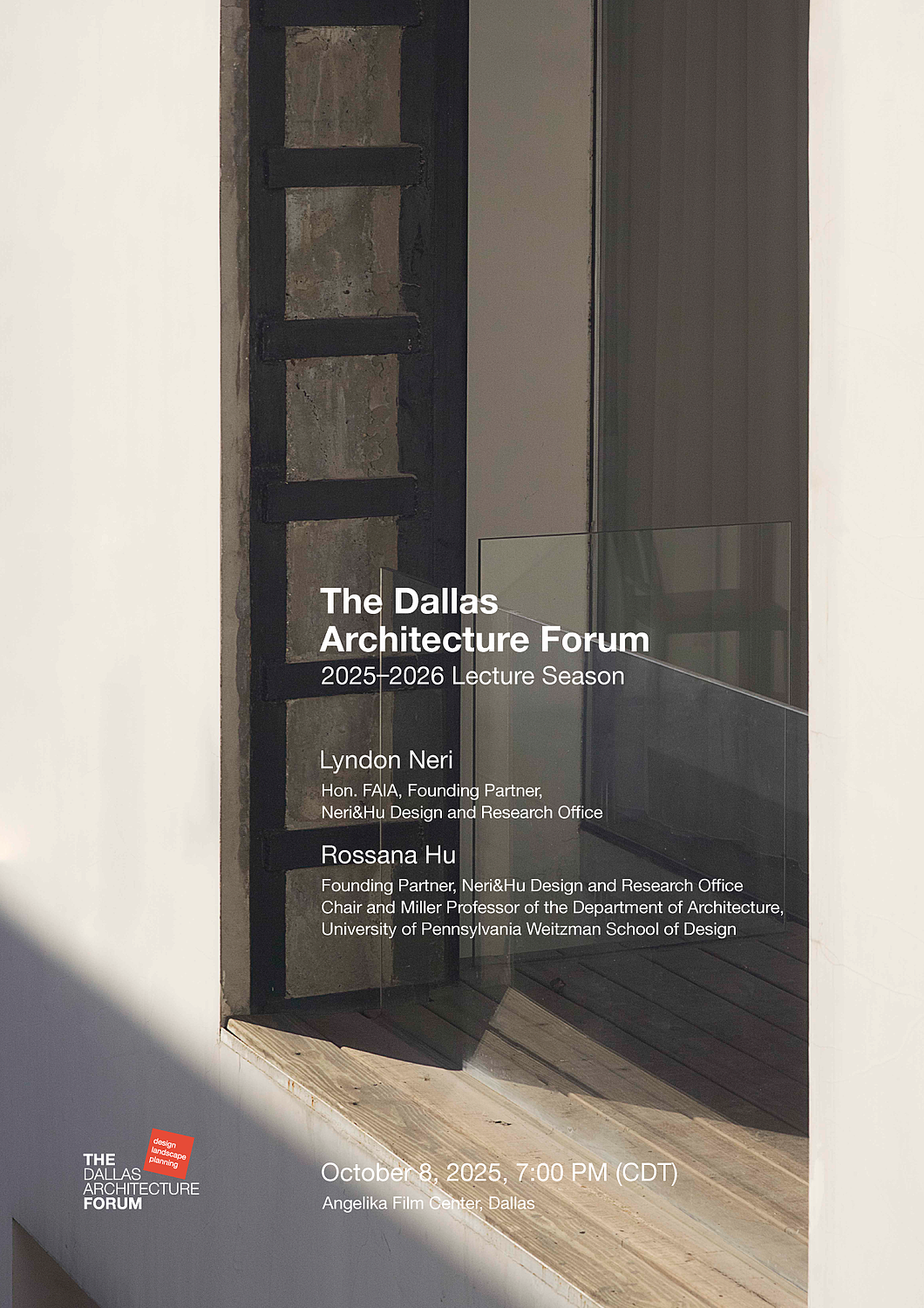 Lyndon Neri, Hon. FAIA and Rossana Hu, Founding Partners of Neri&Hu Design and Research Office, have been invited to deliver the inaugural lecture of the Dallas Architecture Forum's 2025–2026 Lecture Season. The lecture will take place at 7:00 pm (CDT) on October 8 at the Angelika Film Center in Dallas.
